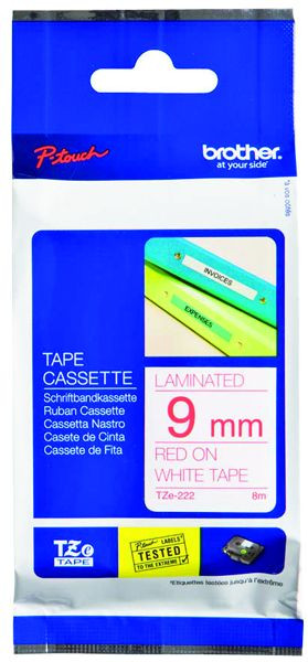 Brother TZe-222 Schriftband - rot auf weißOriginal Brother TZe-222 laminiertes Schriftband - 9 mm breit, 8 m langRot auf weißLaminiert durch patentierten Hinterbanddruck9 mm breit, 8 m langWisch-, wetter- und kratzfestTemperatur-, chemie- und UV-beständigBeständige, perfekt lesbare Ergebnisse