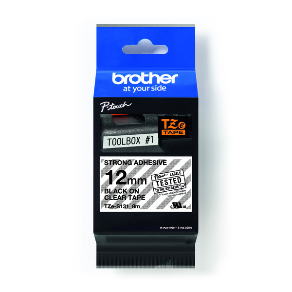 Pro Tape TZe-S131, Schwarz auf transparent, 12 mm breit, 8 m lang, Laminiert durch patentierten Hinterbanddruck, Für glatte, raue, strukturierte und beschichtete Oberflächen, Höhere Klebkraft im Vergleich zu selbstklebenden TZe-Standardschriftbändern, Konform mit Standard UL969