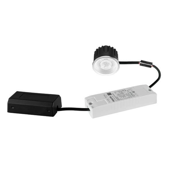 Set bestehend aus LED-Einsatz 3CCT, CRI>80 und Konverter, DALI dimmbar, mit Anschlussbox, schwarz / aluminium matt. Set inkl. Konverter für 230 V-Netzspannung, DALI-2 dimmbar, Maße Konverter: L 130 x B 42 x H 22 mm Ausführung: Plug&Play, Material: Aluminium / PMMA / Kunststoff, Schutzart raumseitig: nach DIN EN 60529: IP20, Schutzklasse: (EN 61140) II, Leistung: 7,3 W, Anzahl der Leuchtmittel / Fassungen: 1 Stück, Lichtstrom: 922 lm, Farbtemperatur: von 2.700 K bis 4.000 K, Abstrahlwinkel: 50°, Mit Betriebsgerät: Ja, Dimmbar: Ja, Art der Dimmung: DALI-2.