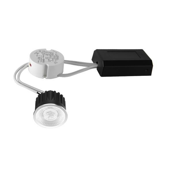 Set bestehend aus LED-Einsatz 3CCT, CRI>80 und Rundkonverter, DALI dimmbar, mit Anschlussbox, schwarz / aluminium matt. Set inkl. Rundkonverter für 230 V-Netzspannung, DALI-2 dimmbar, Maße Konverter: D 56 x H 25 mm Ausführung: Plug&Play, Material: Aluminium / PMMA / Kunststoff, Schutzart raumseitig: nach DIN EN 60529: IP20, Schutzklasse: (EN 61140) II, Leistung: 7,1 W, Anzahl der Leuchtmittel / Fassungen: 1 Stück, Lichtstrom: 918 lm, Farbtemperatur: von 2.700 K bis 4.000 K, Abstrahlwinkel: 50°, Mit Betriebsgerät: Ja, Dimmbar: Ja, Art der Dimmung: DALI.