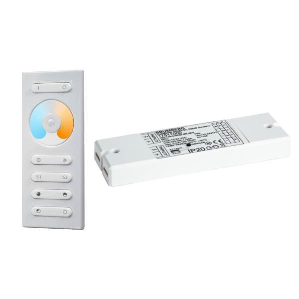 TunableWhite-Funksteuerung, weiß. TunableWhite-Funksteuerung zur Ansteuerung von zweifarbigen LED-Modulen im Weißlichtbereich. Controller: Spannung: 12-24 V DC, Strom: max. 2 x 5 A, Leistung: max. 120 W / 240 W (12 V DC / 24 V DC), Ansteuerung: negativ (gemeinsame Anode), Steuersignal: PWM, Funkfrequenz: 869,5 MHz, Reichweite (Sichtverbindung): bis zu 20 m, Maße: L 178 x B 46 x H 18 mm, Material: Kunststoff, Lieferung: inkl. Zugentlastung, Controller pro Fernbedienung: max. 4 (bei optimaler Funkverbindung) Fernbedienung: Spannung (Batterie): 4,5 V DC - 3 x AAA (nicht im Lieferumfang), Funkfrequenz: 869,5 MHz, Sendeleistung (Ps) < 0 dBm, Reichweite (Sichtverbindung): bis zu 20 m, Maße: L 120 x B 48 x H 18 mm, Material: Kunststoff Funktionsumfang: - Ein / Aus - Lichtfarbwechsel über Touchwheel - Dimmung der eingestellten Lichtfarbe - Speichertasten S1 / S2 - Wahltasten 25 % / 50 % / 75 % / 100 % Helligkeit Schutzart raumseitig: nach DIN EN 60529: IP20, Schutzklasse: (EN 61140) III, Spannung: 12V 24V, Leistung: 240 W, Art der Dimmung: Funksteuerung.