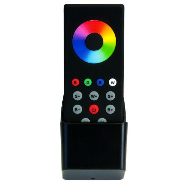 Fernbedienung zu RGB(W)-Steuerung 18192000, schwarz. Maße: 120 x 50 x 15 mm, Frequenz: 868 MHz, Reichweite: bis zu 20 m, Batterien: 3 x 1,5 V DC AAA (nicht im Lieferumfang) Die folgenden Funktionen sind über die Fernbedienung abrufbar: - intuitive Farbeinstellung über Touch-Farbwahlrad (RGB) - Auswahl von 4 verschiedenen Programmen (weicher Farbwechsel, weicher Farbwechsel warme Farben, weicher Farbwechsel kalte Farben, harter Farbwechsel) - Erhöhung und Verringerung der Programmgeschwindigkeit - Erhöhung und Verringerung der Helligkeit über Funktionstaste + Farbrad - Betrieb und Auswahl von 2 getrennten Zonen (Mehrraumsteuerung) über eine Fernbedienung - Ein- und Ausschalten der Beleuchtungsanlage - bis zu 4 Farben können direkt abgespeichert werden und über jeweilige Tasten direkt abgerufen werden.