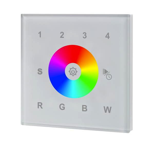 RGBW-Funk-Wandpanel zu 18192000, weiß. Einbaumontage, Wandmontage RGBW-Funk-Wandpanel zur Ansteuerung von RGBW-LED-Modulen für Farb- und Weißlicht. Nennpannung: 110-230 V AC 50 Hz, Stromaufnahme: 15 mA, Funkfrequenz: 869,5 MHz, Sendeleistung (Ps) < 0 dBm, Reichweite (Sichtverbindung): bis zu 20 m, Umgebungstemperatur (ta): 0 °C bis +40 °C, Anschluss über Schraubklemmen, Montage in Gerätedose (Unterputz), Einbautiefe in Gerätedose: 20 mm, Außenabmessungen: L 86 x B 86 x T 12 mm, Material: Glas / Kunststoff, Controller pro Wandpanel: max. 4 (bei optimaler Funkverbindung) Funktionsumfang: - Ein / Aus - RGB-Farbwechsel über Touchwheel - Dimmtasten für rot / grün / blau / weiß - Dimmung der eingestellten Lichtfarbe - Speichertaste S - Farbverlauf: Start / Stopp - Farbverlauf: Geschwindigkeit Kompatibel zu Funk-Master-Controller 18192000, weitere Funktionen entnehmen Sie bitte der Produktbeschreibung. Montageart: Einbaumontage, Montageort: Wandmontage, Schutzart raumseitig: nach DIN EN 60529: IP20, Schutzklasse: (EN 61140) II, Spannung: 230V AC 50Hz, Art der Dimmung: Funksteuerung.