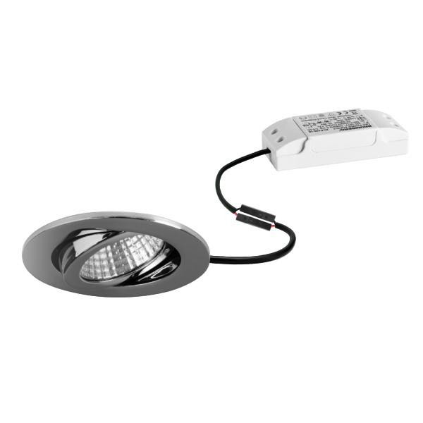 LED-Einbaustrahlerset, IP65, schaltbar, chrom glänzend, rund. Ausgeführt in kompakter Bauform für werkzeuglose Schnellmontage zum Deckeneinbau. Set inkl. Konverter für 230 V-Netzspannung, schaltbar, Maße Konverter: L 71 x B 36 x H 22 mm Montageart: Einbaumontage, Montageort: Deckenmontage, Material: Aluminium / Stahl / Silikonkautschuk / Polycarbonat, Schutzart raumseitig: nach DIN EN 60529: IP65, Schutzklasse: (EN 61140) II, Spannung: 230V AC 50Hz, Leistung: 6 W, Anzahl der Leuchtmittel / Fassungen: 1 Stück, Lichtstrom: 730 lm, Farbtemperatur: 3.000 K, Abstrahlwinkel: 38°, Verstellbarkeit: schwenkbar, Mit Betriebsgerät: Ja, Dimmbar: Nein, Art der Dimmung: schaltbar.
