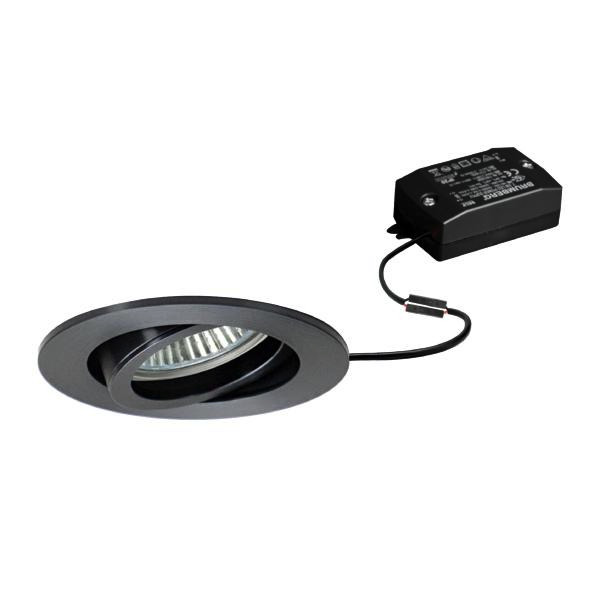 LED-Einbaustrahlerset, schaltbar, vinylschwarz glänzend, rund. Ausgeführt in kompakter Bauform für werkzeuglose Schnellmontage zum Deckeneinbau. Set inkl. Konverter für 230 V-Netzspannung, schaltbar, Maße Konverter: L 68 x B 35 x H 21 mm Montageart: Einbaumontage, Montageort: Deckenmontage, Material: Aluminium / Glas / Kunststoff, Schutzart raumseitig: nach DIN EN 60529: IP20, Schutzklasse: (EN 61140) II, Spannung: 230V AC 50Hz, Leistung: 6 W, Anzahl der Leuchtmittel / Fassungen: 1 Stück, Lichtstrom: 730 lm, Farbtemperatur: 3.000 K, Abstrahlwinkel: 38°, Verstellbarkeit: schwenkbar, Mit Betriebsgerät: Ja, Dimmbar: Nein, Art der Dimmung: schaltbar.