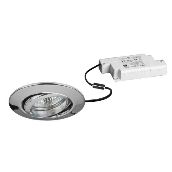 LED-Einbaustrahlerset, Phasenabschnitt dimmbar, chrom glänzend, rund. Ausgeführt in kompakter Bauform für werkzeuglose Schnellmontage zum Deckeneinbau. Set inkl. Konverter für 230 V-Netzspannung, Phasenabschnitt dimmbar, Maße Konverter: L 110 x B 50 x H 19 mm Ausführung: ohne Fassung, Montageart: Einbaumontage, Montageort: Deckenmontage, Material: Zinkguss / Aluminiumguss / Aluminium / Glas / Kunststoff, Schutzart raumseitig: nach DIN EN 60529: IP20, Schutzklasse: (EN 61140) II, Spannung: 230V AC 50Hz, Leistung: 6 W, Anzahl der Leuchtmittel / Fassungen: 1 Stück, Lichtstrom: 730 lm, Farbtemperatur: 3.000 K, Abstrahlwinkel: 38°, Verstellbarkeit: schwenkbar, Mit Betriebsgerät: Ja, Dimmbar: Ja, Art der Dimmung: Phasenabschnitt.