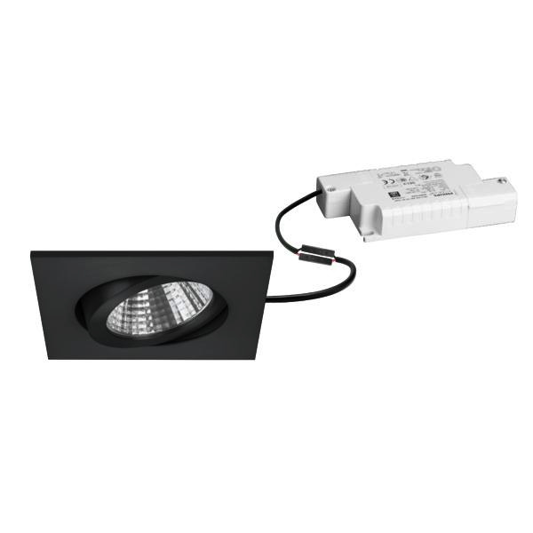 LED-Einbaustrahlerset, Phasenabschnitt dimmbar, schwarz matt, quadratisch. Ausgeführt in kompakter Bauform für werkzeuglose Schnellmontage zum Deckeneinbau. Set inkl. Konverter für 230 V-Netzspannung, Phasenabschnitt, Maße Konverter: L 110 x B 50 x H 19 mm Ausführung: ohne Fassung, Montageart: Einbaumontage, Montageort: Deckenmontage, Material: Aluminium / Polycarbonat, Schutzart raumseitig: nach DIN EN 60529: IP20, Schutzklasse: (EN 61140) II, Spannung: 230V AC 50Hz, Leistung: 7 W, Anzahl der Leuchtmittel / Fassungen: 1 Stück, Lichtstrom: 740 lm, Farbtemperatur: 3.000 K, Abstrahlwinkel: 38°, Verstellbarkeit: schwenkbar, Mit Betriebsgerät: Ja, Dimmbar: Ja, Art der Dimmung: Phasenabschnitt.