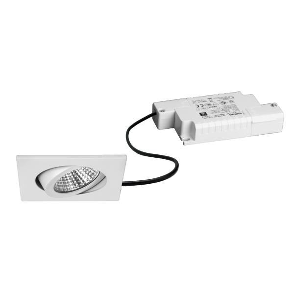 LED-Einbaustrahlerset, Phasenabschnitt dimmbar, weiß glänzend, quadratisch. Ausgeführt in kompakter Bauform für werkzeuglose Schnellmontage zum Deckeneinbau. Set inkl. Konverter für 230 V-Netzspannung, Phasenabschnitt dimmbar, Maße Konverter: L 110 x B 50 x H 19 mm Montageart: Einbaumontage, Montageort: Deckenmontage, Material: Aluminium / Polycarbonat, Schutzart raumseitig: nach DIN EN 60529: IP20, Schutzklasse: (EN 61140) II, Spannung: 230V AC 50Hz, Leistung: 6 W, Anzahl der Leuchtmittel / Fassungen: 1 Stück, Lichtstrom: 630 lm, Farbtemperatur: 3.000 K, Abstrahlwinkel: 38°, Verstellbarkeit: schwenkbar, Mit Betriebsgerät: Ja, Dimmbar: Ja, Art der Dimmung: Phasenabschnitt.