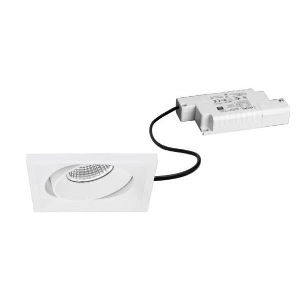 LED-Einbaustrahlerset, Phasenabschnitt dimmbar, strukturweiß, quadratisch. Ausgeführt in kompakter Bauform für werkzeuglose Schnellmontage zum Deckeneinbau. Set inkl. Konverter für 230 V-Netzspannung, Phasenabschnitt dimmbar, Maße Konverter: L 110 x B 50 x H 19 mm Montageart: Einbaumontage, Montageort: Deckenmontage, Material: Aluminium / Polycarbonat, Schutzart raumseitig: nach DIN EN 60529: IP20, Schutzklasse: (EN 61140) II, Spannung: 230V AC 50Hz, Leistung: 7 W, Anzahl der Leuchtmittel / Fassungen: 1 Stück, Lichtstrom: 680 lm, Farbtemperatur: 3.000 K, Abstrahlwinkel: 40°, Verstellbarkeit: schwenkbar, Mit Betriebsgerät: Ja, Dimmbar: Ja, Art der Dimmung: Phasenabschnitt.