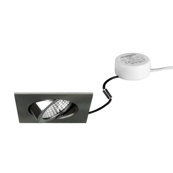 LED-Einbaustrahlerset, Phasenabschnitt dimmbar (Rundkonverter), nickel matt, quadratisch. Ausgeführt in kompakter Bauform für werkzeuglose Schnellmontage zum Deckeneinbau. Set inkl. Rundkonverter für 230 V-Netzspannung, Phasenabschnitt dimmbar, Maße Konverter: D 51 x H 24 mm Montageart: Einbaumontage, Montageort: Deckenmontage, Material: Aluminium / Polycarbonat, Schutzart raumseitig: nach DIN EN 60529: IP20, Schutzklasse: (EN 61140) II, Spannung: 230V AC 50Hz, Leistung: 6 W, Anzahl der Leuchtmittel / Fassungen: 1 Stück, Lichtstrom: 630 lm, Farbtemperatur: 3.000 K, Abstrahlwinkel: 38°, Verstellbarkeit: schwenkbar, Mit Betriebsgerät: Ja, Dimmbar: Ja, Art der Dimmung: Phasenabschnitt.