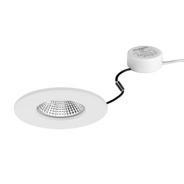 LED-Einbaudownlightset, IP65, Phasenabschnitt dimmbar (Rundkonverter), weiß struktur, rund. Ausgeführt in kompakter Bauform für werkzeuglose Schnellmontage zum Deckeneinbau. Set inkl. Konverter für 230 V-Netzspannung, Phasenabschnitt dimmbar, Maße Konverter: D 51 x H 24 mm Montageart: Einbaumontage, Montageort: Deckenmontage, Material: Aluminium / Silikonkautschuk / PMMA, Schutzart raumseitig: nach DIN EN 60529: IP65, Schutzklasse: (EN 61140) II, Spannung: 230V AC 50Hz, Leistung: 7 W, Anzahl der Leuchtmittel / Fassungen: 1 Stück, Lichtstrom: 620 lm, Farbtemperatur: 3.000 K, Abstrahlwinkel: 36°, Verstellbarkeit: nicht verstellbar, Mit Betriebsgerät: Ja, Dimmbar: Ja, Art der Dimmung: Phasenabschnitt.