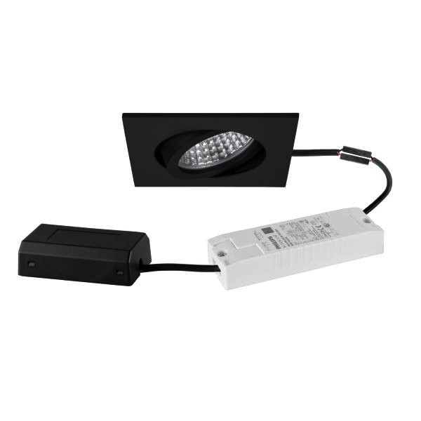 LED-Einbaustrahlerset, DALI dimmbar, mit Anschlussbox, schwarz matt, quadratisch. Ausgeführt in kompakter Bauform für werkzeuglose Schnellmontage zum Deckeneinbau. Set inkl. Konverter für 230 V-Netzspannung, DALI-2 dimmbar, ohne Nachglimm-Effekt, Maße Konverter: L 130 x B 42 x H 22 mm Montageart: Einbaumontage, Montageort: Deckenmontage, Material: Aluminium / Glas / Kunststoff, Schutzart raumseitig: nach DIN EN 60529: IP20, Schutzklasse: (EN 61140) II, Spannung: 230V AC 50Hz, Leistung: 6 W, Anzahl der Leuchtmittel / Fassungen: 1 Stück, Lichtstrom: 730 lm, Farbtemperatur: 3.000 K, Abstrahlwinkel: 38°, Verstellbarkeit: schwenkbar, Mit Betriebsgerät: Ja, Dimmbar: Ja, Art der Dimmung: DALI-2.