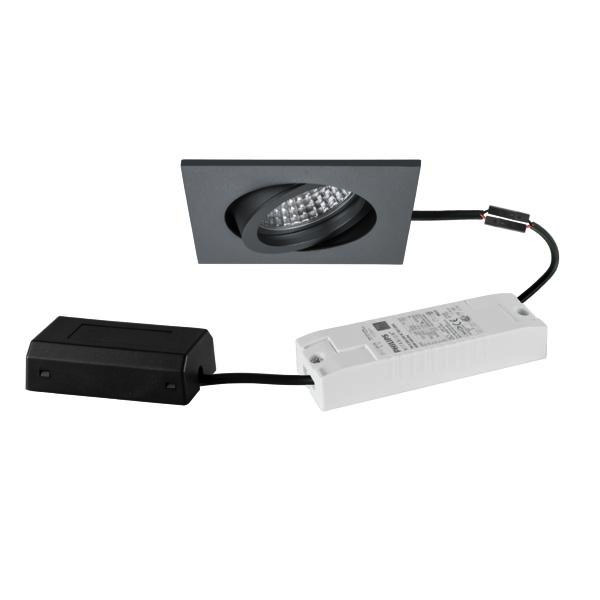 LED-Einbaustrahlerset, DALI dimmbar, mit Anschlussbox, titan matt, quadratisch. Ausgeführt in kompakter Bauform für werkzeuglose Schnellmontage zum Deckeneinbau. Set inkl. Konverter für 230 V-Netzspannung, DALI-2 dimmbar, ohne Nachglimm-Effekt, Maße Konverter: L 130 x B 42 x H 22 mm Montageart: Einbaumontage, Montageort: Deckenmontage, Material: Aluminium / Glas / Kunststoff, Schutzart raumseitig: nach DIN EN 60529: IP20, Schutzklasse: (EN 61140) II, Spannung: 230V AC 50Hz, Leistung: 6 W, Anzahl der Leuchtmittel / Fassungen: 1 Stück, Lichtstrom: 730 lm, Farbtemperatur: 3.000 K, Abstrahlwinkel: 38°, Verstellbarkeit: schwenkbar, Mit Betriebsgerät: Ja, Dimmbar: Ja, Art der Dimmung: DALI-2.