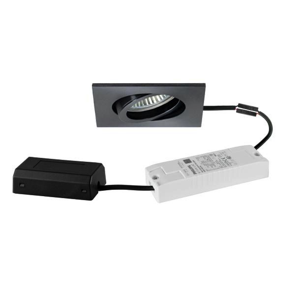 LED-Einbaustrahlerset, DALI dimmbar, mit Anschlussbox, vinylschwarz glänzend, quadratisch. Ausgeführt in kompakter Bauform für werkzeuglose Schnellmontage zum Deckeneinbau. Set inkl. Konverter für 230 V-Netzspannung, DALI-2 dimmbar, ohne Nachglimm-Effekt, Maße Konverter: L 130 x B 42 x H 22 mm Montageart: Einbaumontage, Montageort: Deckenmontage, Material: Aluminium / Glas / Kunststoff, Schutzart raumseitig: nach DIN EN 60529: IP20, Schutzklasse: (EN 61140) II, Spannung: 230V AC 50Hz, Leistung: 6 W, Anzahl der Leuchtmittel / Fassungen: 1 Stück, Lichtstrom: 730 lm, Farbtemperatur: 3.000 K, Abstrahlwinkel: 38°, Verstellbarkeit: schwenkbar, Mit Betriebsgerät: Ja, Dimmbar: Ja, Art der Dimmung: DALI-2.