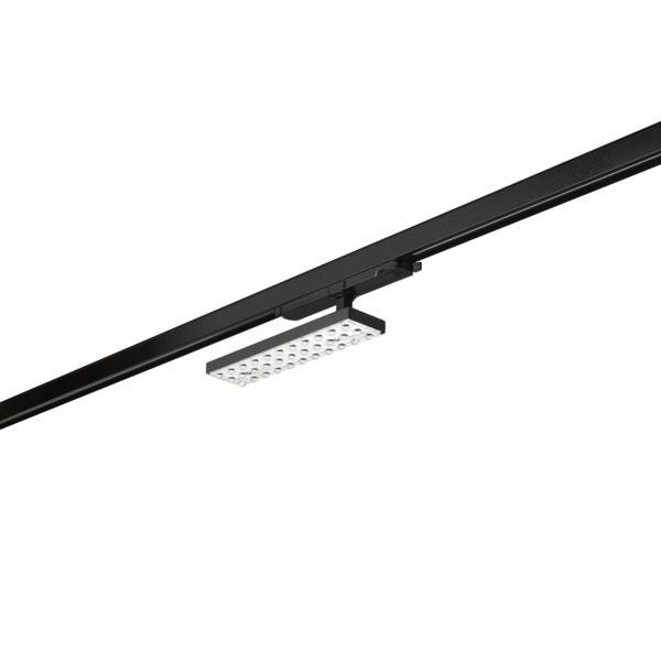 LED-Schienenstrahler, drehbar und schwenkbar, DALI dimmbar, strukturschwarz, rechteckig. Stromschienenmontage, Deckenmontage Ausführung: LED, Montageart: Stromschienenmontage, Montageort: Deckenmontage, Material: Stahl / Kunststoff, Schutzart raumseitig: nach DIN EN 60529: IP20, Schutzklasse: (EN 61140) II, Spannung: 230V AC 50Hz, Leistung: 20 W, Anzahl der Leuchtmittel / Fassungen: 1 Stück, Lichtstrom: 2.600 lm, Farbtemperatur: 3.000 K, Lichtfarbe: weiß, Abstrahlwinkel Längs: 72°, Abstrahlwinkel Quer: 53°, Verstellbarkeit: drehbar und schwenkbar, Mit Betriebsgerät: Ja, Dimmbar: Ja, Art der Dimmung: DALI-2.