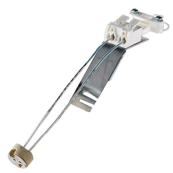 Bügel mit Fassung GX5,3, mit Zugentlastung. Zur Steckbefestigung mit 2-poliger Steckklemme 2 x 2,5 mm² und Zugentlastung. Ausführung: GX5,3, Material: Stahl / Kunststoff / Keramik, Schutzart raumseitig: nach DIN EN 60529: IP20, Schutzklasse: (EN 61140) III, Spannung: 12 V, Art der Dimmung: sonstige.