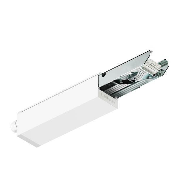 Einspeisebox 7-pol. weiß, rechteckig. Einspeisebox für modulares Schnellmontage-Lichtbandsystem zur stirnseitigen Netzeinspeisung kompatibler 7-poliger Tragschienen. Geschlossene Gehäuseausführung mit integrierter Zugentlastung und vorkonfektionierter Innenverdrahtung 2,5 mm². Elektromechanische Verbindung zur Tragschiene mittels verpolungssicherer Steckkontaktierung. Durchgängige Schutzleiterführung (PE) über die gesamte Systemlänge. Geeignet für Leiterbelegung (L1, L2, L3, N, PE, DIM+, DIM-). Schutzklasse I gemäß EN 61140. Schutzart IP20 gemäß DIN EN 60529. Zulässige Umgebungstemperatur -20 °C bis +35 °C. Oberfläche pulverbeschichtet, Farbe weiß (RAL 9016)., Material: Aluminium, Schutzart raumseitig: nach DIN EN 60529: IP20, Schutzklasse: (EN 61140) I.