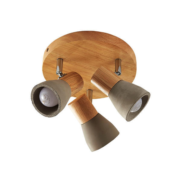 Decken-Anbauleuchte, für E14-LED-Retrofit-Lampen, mit Holzgehäuse und Betonschirmen, holz hell / beton matt, rund. Ausführung in kompakter Bauform für die harmonische Implementierung in stimmige, architektonische Raumkonzepte. Ausführung: E14, Montageart: Anbaumontage, Montageort: Deckenmontage, Material: Holz / Beton, Schutzart raumseitig: nach DIN EN 60529: IP20, Schutzklasse: (EN 61140) I, Spannung: 230V AC 50Hz, Leistung: 5 W, Anzahl der Leuchtmittel / Fassungen: 3 Stück, Verstellbarkeit: drehbar und schwenkbar, ohne Betriebsgerät, Art der Dimmung: sonstige.