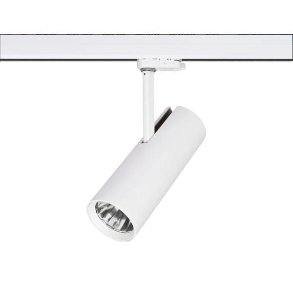 LED-Schienenstrahler, dreh- und schwenkbar, schaltbar, strukturweiß, rund. Ausführung in kompakter Bauform für die harmonische Implementierung in stimmige, architektonische Raumkonzepte. Wärmeableitung: passiv (ohne Lüfter), Inkl. Betriebsgerät, schaltbar, (230 V AC 50 Hz). Leuchte inkl. Euro-Adapter für Standard-3-Phasen-Schienen. Ausführung: ohne Fassung, Montageart: Anbaumontage, Montageort: Deckenmontage, Material: Aluminium, Schutzart raumseitig: nach DIN EN 60529: IP20, Schutzklasse: (EN 61140) I, Spannung: 230V AC 50Hz, Leistung: 23 W, Anzahl der Leuchtmittel / Fassungen: 1 Stück, Lichtstrom: 2.880 lm, Farbtemperatur: 3.000 K, Lichtfarbe: weiß, Abstrahlwinkel: 36°, Verstellbarkeit: drehbar und kopfverstellbar, Mit Betriebsgerät: Ja, Art der Dimmung: schaltbar.