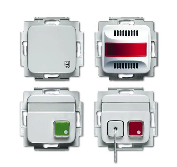 Ruf-Set für Behinderten-WC, alpinweiß, Sicherheitstechnik, Busch-Infoline, Ruf-Set für Behinderten-WC Zum Aufbau einer Notrufanlage für Behinderten-WCs. Bestehend aus: Netzteil-Einsatz, Alarmmelde-Einsatz, Signaltaster-Einsatz mit Zugschnur und Abstelltaster-Einsatz. Rufauslösung über Zugschnurtaster. Optische und akustische Notrufsignalisierung außerhalb des Behinderten-WCs. Beruhigungslicht bei Rufauslösung. Beschriftungsfeld: 51 x 10 mm. Bedienelemente: Zugschnur und Abstelltaste. Anzeigeelemente: LED Blinklicht, Summer und Beruhigungslicht. Nennspannung: , +10 % / -10 % Nennfrequenz: 50 Hz/60 Hz Eingänge: 1 Ausgänge: 1x Schließer, potenzialgebunden Steuer-/Signalausgänge: 1, Wechsler, potenzialfrei, 42 V~/60 V-, 30 W/VA Schutzart Gerät: IP 20 Temperaturbereich Gerät: 5 °C bis 40 °C