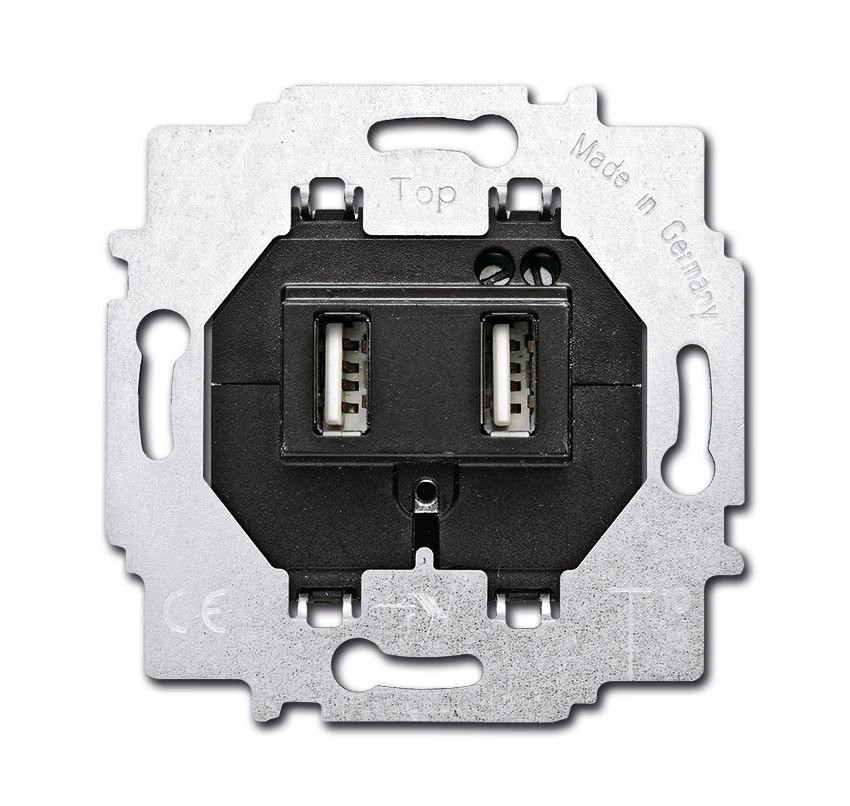 USB-Netzteil-Einsatz, USB-Ladegeräte, USB-Ladegeräte, USB-Netzteil-Einsatz Zum Laden und Versorgen mobiler Endgeräte über USB-Kabel. Mit 2 USB Typ A Steckbuchsen. Gleichzeitiges Laden von 2 Endgeräten möglich. Mit elektronischem Kurzschlussschutz. Mit elektronischem Überlastschutz. Nennspannung: 230 V~, +10 % / -10 % Sekundär: , +5 % / -5 % Nennfrequenz: 50 Hz/60 Hz Lastart: 1 Buchse belegt: Nennstrom: 1400 mA Lastart: beide Buchsen belegt, jeweils: Nennstrom: 700 mA Schutzart Gerät: IP 20, SELV Temperaturbereich Gerät: 5 °C bis 40 °C Maße (H x B x T): 71 mm x 71 mm x 43 mm Einbautiefe: 32 mm