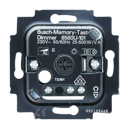 Mit Lichtwertspeicherung und Phasenanschnitt. Für Glühlampen, 230 V-Halogenglühlampen und Niedervolt-Halogenlampen mit konventionellem Transformator. Kompatibel zu den Bedienelementen 6543-xxx-10x. Bedienung auch über konventionelle Taster (2020 US, 2021/6 UK) möglich. Parallelbetrieb mehrerer Transformatoren und/oder Glühlampen möglich. Ohne Bedienelement. Bei konventionellen Trafos ~20 % Trafoverluste berücksichtigen. Nur in Verbindung mit handelsüblichen UP-Gerätedosen nach DIN 49073, montieren oder Busch-Jaeger Art.-Nr. 3040 UP-Dose Mauerwerk, 3050 UP-Dose Hohlwand oder 3060 UP-Dose Beton)