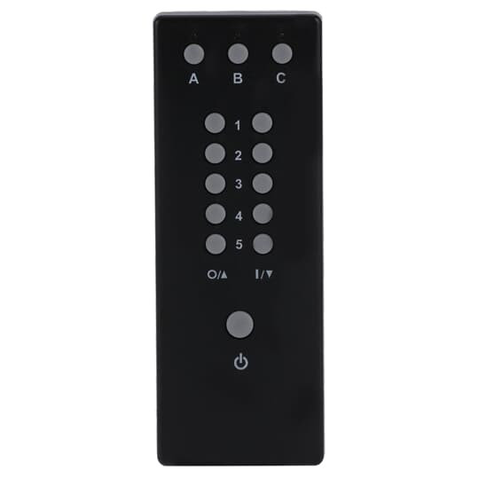 Netzunabhängige Funk-Fernbedienung zum Schalten und Dimmen, zur Jalousie-und zur Lichtszenensteuerung, mit 3 Gruppen (A,B oder C) mit jeweils 5 Kanalpaaren, es können 15 Funkkanäle einzeln bedient oder bis zu 30 Lichtszenen aufgerufen werden, mit "ALLES AUS" Funktion für zugeordnete Aktoren, Reichweite ca.100m (Freifeld), Lithium-Knopfzelle Typ CR2032, Batterielebensdauer: 5 Jahre, praktisch wartungsfrei
