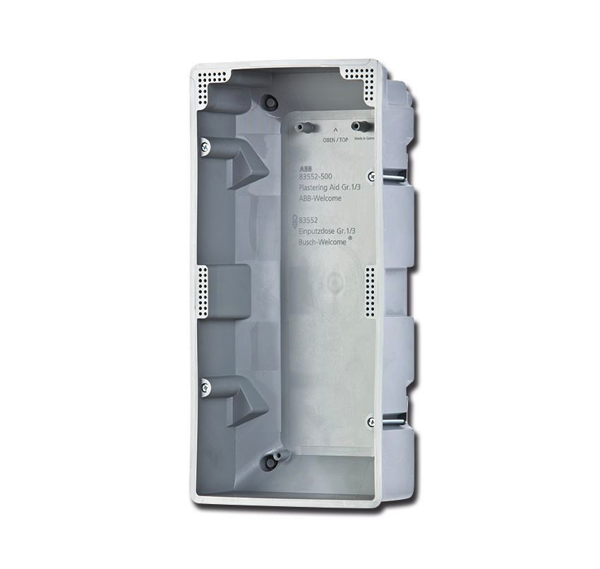 Einputzdose Gr. 1/3, Busch-Welcome (2-Draht-System), Zubehör, Einputzdose Gr. 1/3 Für die Montage in verputzten Fassaden. Montage der Einputzdose erfolgt vor dem Verputzen. Bietet Anschraubpunkte für die Unterputz-Montagedose. Maße (H x B x T): 271 mm x 128 mm x 77 mm