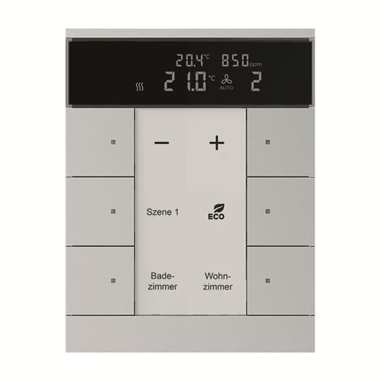 Bedienelement mit Raumtemperaturreglerfunktion und CO2-/Feuchtesensor.