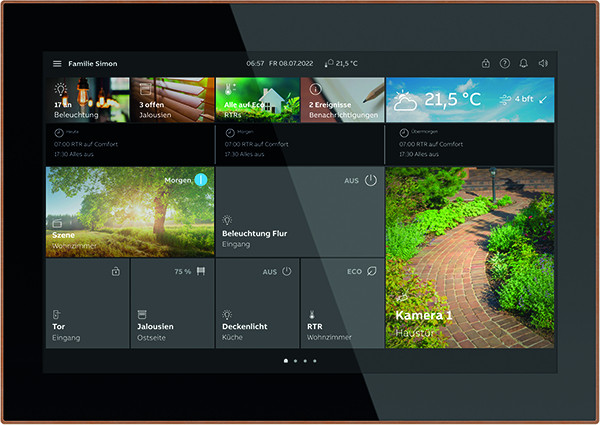 Steuern, beobachten und verwalten Sie Ihre gesamte Anlage mit einem Gerät: Schalten, Dimmen, Jalousiesteuerung sowie verschiedene Steuerelemente für RGBW-Farbsteuerung, HLK-Anwendungen und Audio-Bedienung.