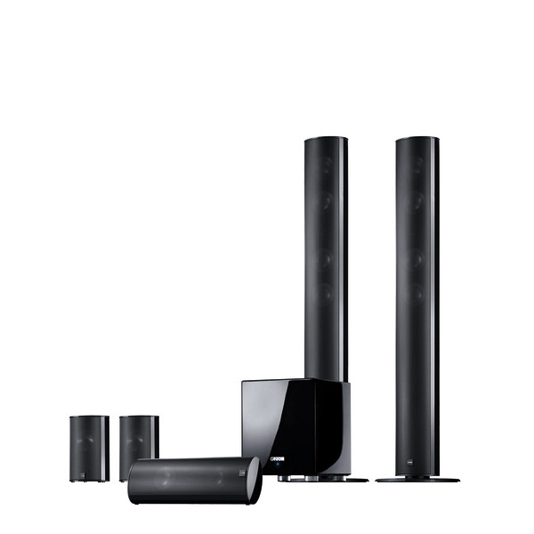 5.1 Heimkino Set mit aktivem Subwoofer, Prinzip Front: 2-Wege Bassreflexsystem, Center: 2-Wege geschlossen, Surround: 2-Wege geschlossen, Subwoofer: geschlossen, Nenn- / Musikbelastbarkeit Front: 90 / 150 Watt, Center: 70 / 130 Watt, Surround: 50 / 120 Watt, Nenn- / Musikleistung Subwoofer: 200 / 280 Watt, Übertragungsbereich Front: 40...30.000 Hz, Center: 45...30.000 Hz, Surround: 45...30.000 Hz, Subwoofer: 30...200 Hz (regelbar), Übergangsfrequenz Front: 400 / 3.300 Hz, Center: 400 / 3.500 Hz, Surround: 3.900 Hz, Subwoofer: 55...200 Hz (regelbar), Tieftonchassis Front: 4 x 110 mm, Aluminium, Center: 1 x 110 mm, Aluminium, Surround: 1 x 110 mm, Aluminium, Subwoofer: 1 x 220 mm, Cellulose/Graphit, Hochtonchassis Front: 1 x 25 mm, Aluminium, Center: 1 x 25 mm, Aluminium, Surround: 1 x 25 mm, Aluminium, Impedanz 4...8 Ohm, Abmessungen (BxHxT) Front: 14,5 x 105 x 10,5 cm, Center: 40 x 14,5 x 10,5 cm, Surround: 14,5 x 21,4 x 10,5 cm, Subwoofer: 27 x 33,3 x 29,5 cm