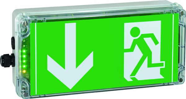 EXIT N in LED-Technik für Zone 1, 2, 21 und 22, Kennzeichnung nach 2014/34/EU, Baumusterprüfbescheinigung nach ATEX, Schutzart IP 66, Erkennungsweite 25 m, Piktogramm nach ISO 7010, Notlicht-Nennbetriebsdauer 3 Stunden, techn. Angaben gem. Herstellerkatalog. PR: Pfleil RECHTS; PU: UNTEN; PL:LINKS