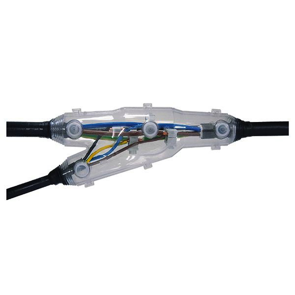 mit je 5 Schraub-Abzweigklemmen, universell verwendbar zum Abzweigen von Kabeln und Leitungen mit Isolierungen aus PVC, PE, VPE und EPR (z.B.: N(A)YY, NYM, TT) ohne und mit konzentrischem Leiter, geeignet für Kupfer- und Aluminiumleiter Gießharz-Abzweigmuffe universell verwendbar zum Abzweigen von Kabeln und Leitungen mit Isolierungen aus PVC, PE, VPE und EPR ohne und mit konzentrischem Leiter. Mit Einzelabzweigklemmen, Geeignet für Kupfer- und Aluminiumleiter. Anwendungsgebiete: Innenraum, Freiluft, Erdreich, Wasser, Installationskanäle. Eigenschaften: Kompakte Abmessungen, Spleißposition vor dem Verguss sichtbar, hochwertige, transparente, schlagfeste Kunststoff-Formschalen, große Einfüllöffnung für leichten Verguss, beständig gegen chemische Einflüsse, beständig gegen Erdalkalien, stabilisiert gegen UV-Strahlen, längs- und querwasserdicht, hohe elektrische Isolationswerte, hohe mechanische Festigkeit, sofort betriebsbereit, einfache und schnelle Montage, zeit- und kostensparend. Lieferumfang: Hydrolysebeständiges PUR-Gießharz EG, mischfertig abgemessen im praktischen Zweikammer-Mischbeutel, transparente Kunststoff-Formschale, Verschlusspfropfen, Schraub-Abzweigklemmen, Einfüll- und Entlüftungstrichter, PVC-Isolierband, Schutzhandschuhe, Montageanleitung.