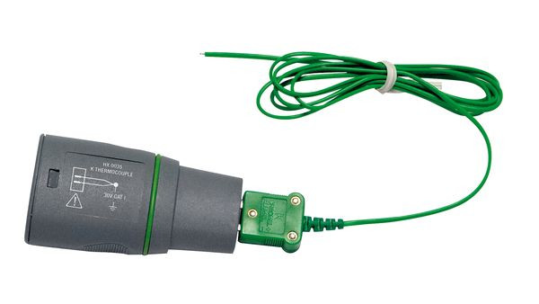 Zubehör für SCOPIX Oszilloskope OX 9000 / OX 7000. Adapter Probix / K-Thermoelement zur Linearisierung von Temperaturmessungen mit einem K-Thermoelementfühler. Automatische Umrechnung, Kompensation der Vergleichsstellentemperatur und Steuerung der Maßeinheit durch das SCOPIX-Oszilloskop. Messumfang: -40 °C … 1250 °C. 30 V CAT I