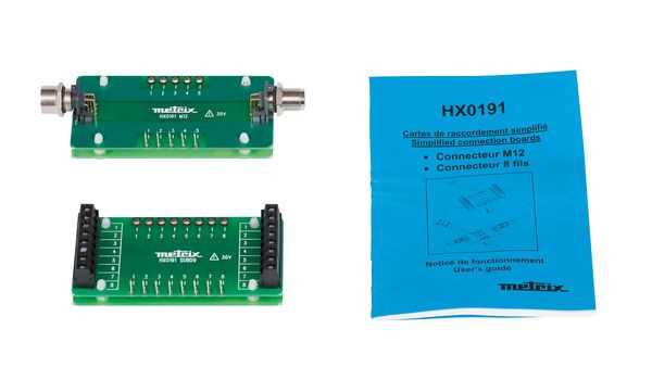 Ersatzteil bzw. Zubehör für SCOPIX BUS-Oszilloskope OX 9302-BUS / OX 7202-BUS / OX 7204-BUS. Set bestehend aus 2 Anschlusskarten mit Stecker M12 und 8-poligem Stecker. Zur Vereinfachung des Anschlusses an den Bus.