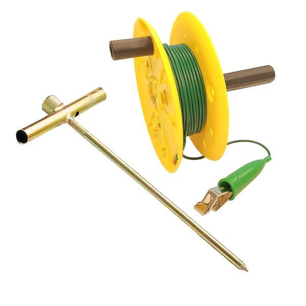 Kompletter Satz mit qualitativ hochwertigem Messzubehör zur Messung von Erdungswiderständen und spezifischen Erdwiderständen. . Geliefert mit: 1 Trommel mit 33 m Messleitung (grün), 1 Erder (T-förmig)