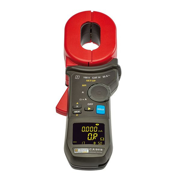 Die Erdungsmesszange C.A 6418 zeigt gleichzeitig den Schleifenwiderstand und den Leckstrom an.