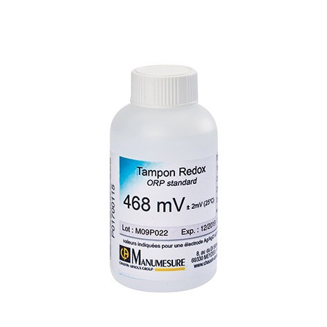 REDOX-Pufferlösung für die Kalibrierung und Feinstellung von Metallelektroden. REDOX-Potential (ORP) (bei 25 °C): 468 mV bei ± 0,02 Abweichung. Lagerdauer vor Öffnung: 24 Monate | Haltbarkeit nach Öffnung: 3 Monate. Verwendung: direkt verwendbare Lösung. Verpackung: Fläschchen mit 125 ml.