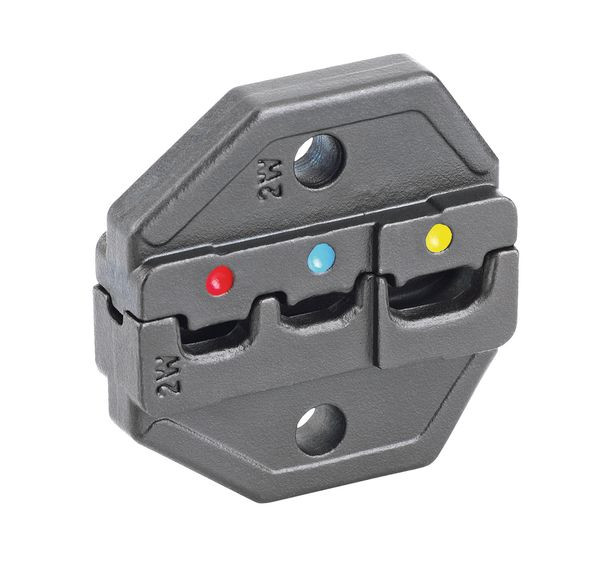 Pressprofileinsatz lose zu 106144, symmetrisch, Ovalpressung, 1 Paar, Presspofileinsätze für isolierte Kabelschuhe nach DIN: 0,5 bis 1 (rot), 1,5 bis 2,5 (blau), 4-6 mm² (gelb), AWG: 18/20-14/16-10/12
