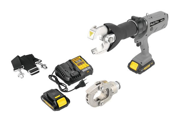 Das akkuhydraulische Wechselsystem MultiPro ermöglicht dank austauschbarer Wechselköpfe die Durchführung ver-schiedenster Anwendungen mit nur einem Gerät in professioneller Qualität, das Grundgerät bietet eine Kraft von 62 kNund einen Hub von 32 mm, eine LED sorgt für die Ausleuchtung des Arbeitsbereiches, die Verriegelung der Wechselköpfe ist einfach zu handhaben, das Gerät verfügt über einen automatischen Rücklauf beim Schneiden und Pressen sowie über eine manuelle Rücklaufoption für Notfälle, die ausbalancierte und ergonomische Gehäuseform sorgt für komfortable Handhabung, zudem verhindert die Motorbremse ein gefährliches Nachlaufen des Kolbens, mit einer Zykluszeit von 3-7 Sekunden und einem Servicezyklus von 20.000 Arbeitsgängen ist das Gerät effizient und langlebig, die Köpfe sind um 180° drehbar für flexible Einsätze, eine Ladestandsanzeige informiert über den Akkustand, und das 18 VLi-ion DEWALT Akkusystem sorgt für zuverlässige Leistung, optional kann ein Schultertragegurt befestigt werden umden Komfort weiter zu erhöhen, das MultiPro Wechselsystem ermöglicht mit separat erhältlichen Einsätzen Pressungen bis zu 300 mm², der Schneidkopf erlaubt das Schneiden von Aluminium- und Kupferleitungen sowie das Schneiden von Kabeln bis zu einem Durchmesser von 50 mm (Kabelklasse 2/5/6 nach IEC 60228), Achtung - der Schneidkopf ist nicht für stahlverstärkte Leitungen (ACSR) geeignet!