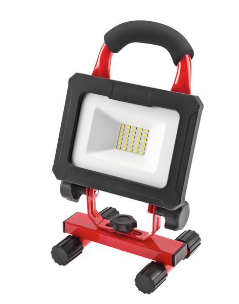 LED 1000 Baustrahler IP65, zwei Dimmstufen (1000 / 500 lm) Lichtfarbe tageslichtweiß (ca. 5700 K). Robustes und standfestes Metall-Gehäuse, um 360° drehbar. Neigungswinkel stufenlos einstellbar. Schutzart IP65. Akku integriert, Betriebszeit bis zu 6 Stunden. Ladekabel und Netzstecker im Lieferumfang enthalten.