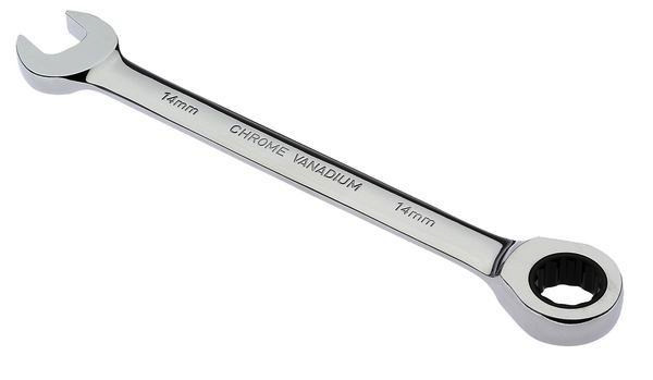 Knarren-Ringmaulschlüssel mit Feinstverzahnung für ratschendes Lösen oder Schnellanzug von Schrauben und Muttern in einem Zug. 72 Zähne stehen für hohe Performance und geringe Rückholwinkel bereits ab 5°. Links- oder Rechtslauf durch einfaches Wenden des Schlüssels, mit zusätzlicher Farbmarkierung. Gabelschlüssel-Werkzeug mit 15°-Kröpfung für ergonomisches Arbeiten. Aus Chrom-Vanadium-Stahl gesenkgeschmiedet, spezialgehärtet, hochglänzend poliert, vernickelt und hartverchromt; 16 mm