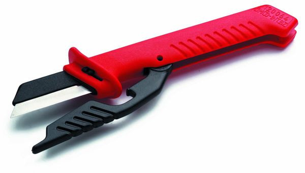 1.000 V Sicherheits-Kabelmesser mit isoliertem Klingenrücken und abklappbarem, im Schaft versenkbarem Klingenschutz, mit auswechselbarer Klinge. Einsetzbar für flexible und massive Einzelader. Klingenlänge: 50 mm.