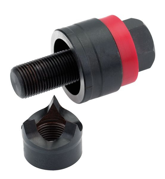 Schraublocher Diamant ein innovativer Spalt-Stempel mit drei Schneidspitzen: Stanzabfall wird in drei Teile gespalten. Geeignet für: Stahlblech (ST 37), Kunststoff und Aluminium. Betätigung: Manuell und hydraulisch. Ausführung: Mit Stempel und Matrize, Zugschraube mit Kugellager. Loch-Ø 37,0 mm; Materialstärke 3,0 mm; Nennmaß PG 29; Schraubengröße 19,0x55,0 mm; Vorbohr-Ø 20,4*mm
