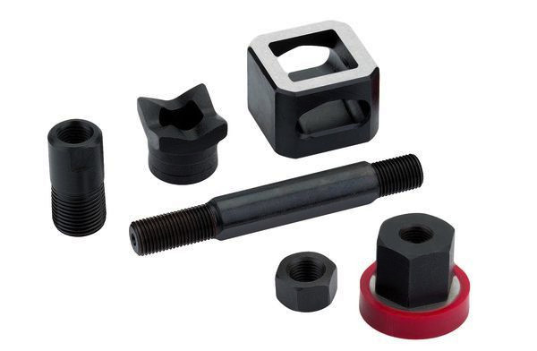 Schraublocher Quadrat ; patentierte Matrize: Mit seitlichem Auswurf für das Abfallstück geeignet für: Stahlblech (ST 37), Kunststoff und Aluminium. Betätigung: Manuell und hydraulisch geeignet für: Stahlblech (ST 37), Kunststoff und Aluminium. Betätigung: Manuell und hydraulisch Ausführung: Mit Stempel, Matrize, Kugellager-Zugschraube (gekapselt), Kontermutter und Adapter für Hydraulik-Betätigung. Aufbewahrung: In praktischem, stabilem Kunststoff-Koffer : Nennmaß 24,0x 24,0 mm, Vorbohr-Ø 14,0 mm, max. Materialstärke: 2,00 mm
