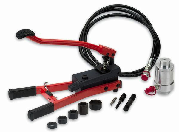 Hydraulische Stanze mit Fußpumpe, ideal bei beengten Platzverhältnissen für Rund-, Rechteck- und Quadrat-Stanzungen im Schaltschrank- und Anlagenbau. Beide Hände frei für genaues Positionieren und Stanzen - Gespreiztes Trägergestell sichert kippstabiles Arbeiten. Stanzkraft: 75 kN mit Überdruckventil; Betriebsdruck max: 700 bar³ - Tankvolumen: 270 cm³ - NutzbaresÖlvolumen: 210cm³ - Fördermenge: 1,7cm je Kolbenhub. Lieferumfang in einem stabilem Stahlblech-Koffer :- Fußpumpe - Hydraulik-Zylinder mit Schnellkupplung - Hydraulik-Schlauch 2,8 m - 2 Hydraulik-Schrauben - Distanzbuchsen-Satz (5-teilig) - Vorbohrer, 11,0 mm