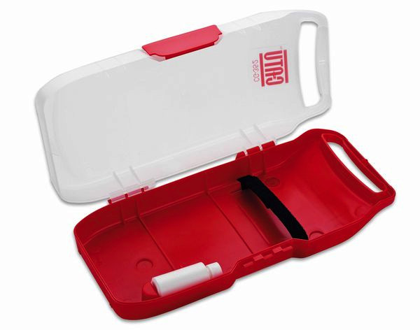 Aufbewahrungsbox zu Elektro-Schutzhandschuh als Transportmittel oder zur sicheren Aufbewahrung in Fahrzeugen oder Werkzeugkoffern, aus bruchfestem Isoliermaterial. Maße: 476x224x100 mm, Gewicht 320 g.