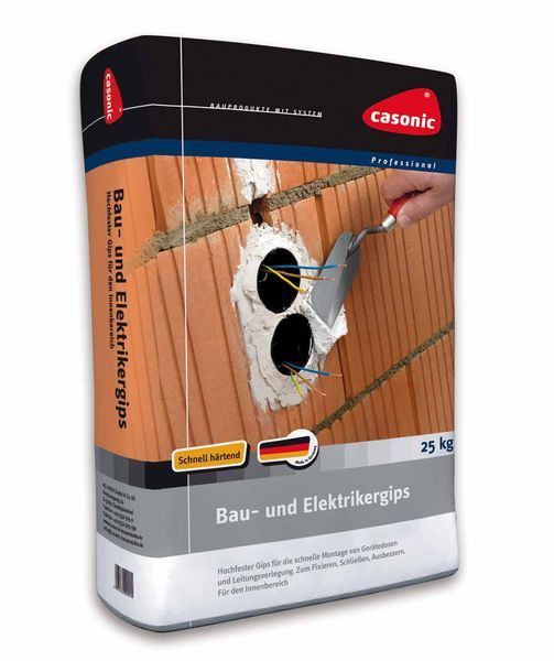 Bau- und Elektrikergips, zum Einsetzen von Steckdosen, Füllen von Löchern, für Ausbesserungs- und Installationsarbeiten, Dübeln, Glätten und Fixieren im Innenbereich. Speziell abgestimmt für Bau- und Elektrikerarbeiten. Auch für Form- und Modellierarbeiten bestens geeignet, Verarbeitungszeit ca. 15-20 Minuten, Mischungsverhältnis ca. 8 l Wasser / 10 kg, Lagerfähigkeit ca. 6 Monate, im Papiersack 25 kg- VE=1Palette; 24 Sack