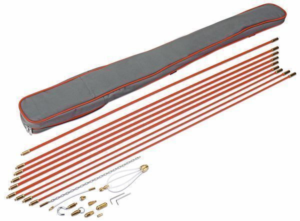 Katimex® Glasfaser-Schubstangen-Sortiment; die Perfekte Lösung um Kabel in Zwischendecken oder beengten Räumen zu verlegen. Mit jeweils einer M5 Innen- bzw. Außengewindehülse am Ende der Schubstange für eine beliebige Verlängerung. Inklusive LED-Leuchtaufsatz für ausreichend Licht und einem Gleitaufsatz bei Hindernissen. Lieferung in praktischer Tasche mit Befestigungsmöglichkeit (z. B. an Leitern). Auch ohne vorhandene Kabelschächte, Leerrohre oder andere Kabelführungen. 21-Teilig; Inhalt: 3 Schubstangen mit einem ø von 6 mm, Länge 1 m, 7 Schubstangen mit einem ø von 8 mm, Länge 1 m, 1 Gleitaufsatz, 1 LED-Lamp 3 Schubstangen Durchmesser 6 mm Länge 1 m, 3 Schubstangen Durchmesser 8 mm Länge 1 m, 1 Gleitaufsatz, 1 LED Lampe, 1 Führungskopf mit Ring, 1 Haken, 1 Führungskopf, 1 Kette, 1 Zugkopf, 1 Magnet, 1 Flex-Stab 15cm, 1 Adapter von M6 auf M5, 1 Zubehörtasche.