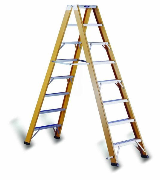 Stufen-Stehleiter, isolierend wirkend bis 1.000 V AC/1.500 V DC. Beidseitig geriffelte Aluminiumstufen für sicheren und bequemen Stand besonders bei langwierigen Arbeiten. Verbindungsgelenk aus Aluminium, beidseitig stabile klappbare Metallstreben gegen unbeabsichtigtes Öffnen der Stehleiter, Belastbarkeit max. 150 kg, Sprossenquerschnitt "C-Profil'' 82x30 mm, Sprossenabstand 250 mm, geprüft gemäß EN 131. Anzahl/Stufen: 2x6; Höhe: 1,52 m; Gewicht: 10,2 kg.